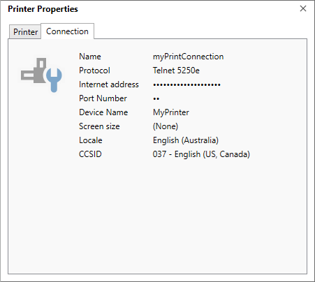This tab is available in the Printer Properties window if you are currently connected to a live printer session. It provides the following information about the current connection: